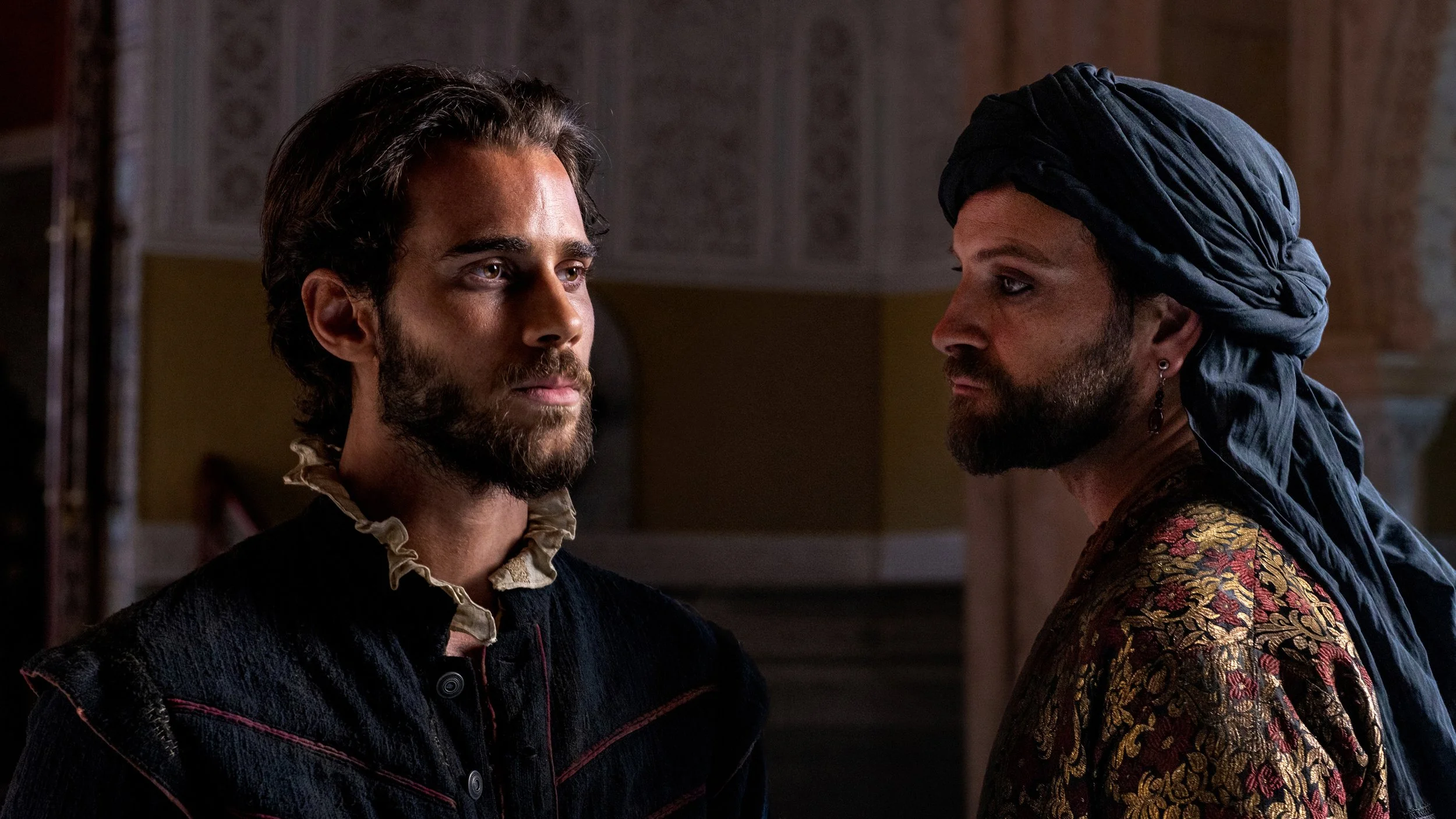 A creative intersection of historical blind spot and character study, Amenábar’s screenplay traces Miguel’s (Julio Peña Fernández) journey to Algiers, 1575. Captured by corsairs while fighting for the Spanish Navy, he now finds himself held hostage by the Lord of Algiers, Hasan (Alessandro Borghi), until someone can pay his ransom. Not so much slaves as they are prisoners of war, Miguel joins many other higher-class individuals held captive and forced to toil away their time within the confines of Hasan’s estate. It does not take long for Hasan to recognize what others already know about Miguel—he can tell a captivating story better than anyone else. His stories entertain his fellow prisoners, but soon become much more valuable as Hasan begins spending time with Miguel, who is forced to craft new stories to dazzle his captor. Through this process, Miguel falls in love with the art of storytelling.